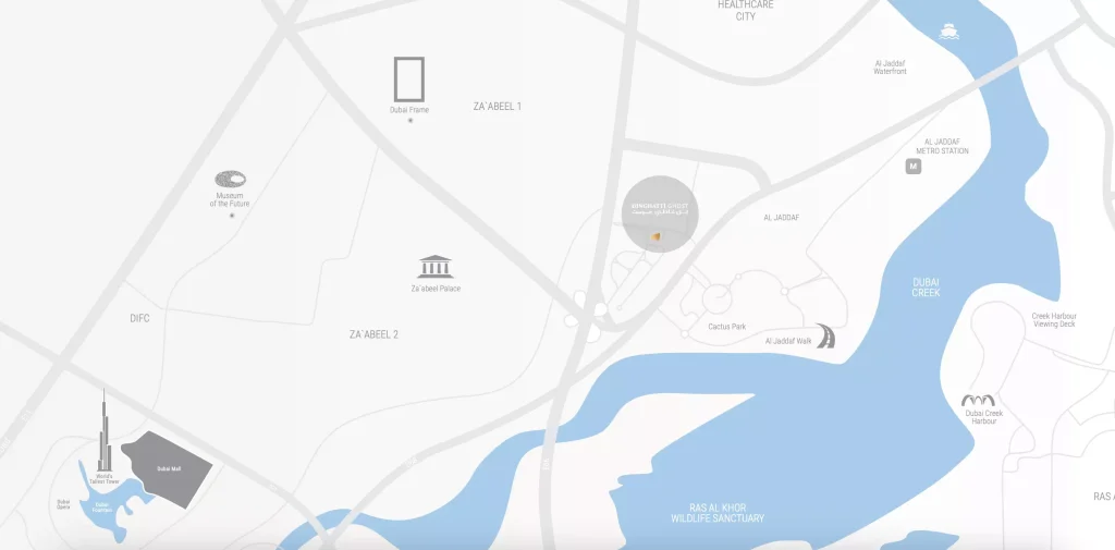 يقع المشروع في منطقة الجداف، التي أصبحت من أبرز المناطق العمرانية الصاعدة في دبي. يمتاز الموقع بقربه من شارع الشيخ زايد ووسط المدينة، إضافة إلى مطار دبي الدولي. كما يمكن الوصول بسهولة إلى برج خليفة، دبي مول، ومستشفى لطيفة، مما يجعل الإقامة في هذا المشروع تجمع بين الراحة والعملية.